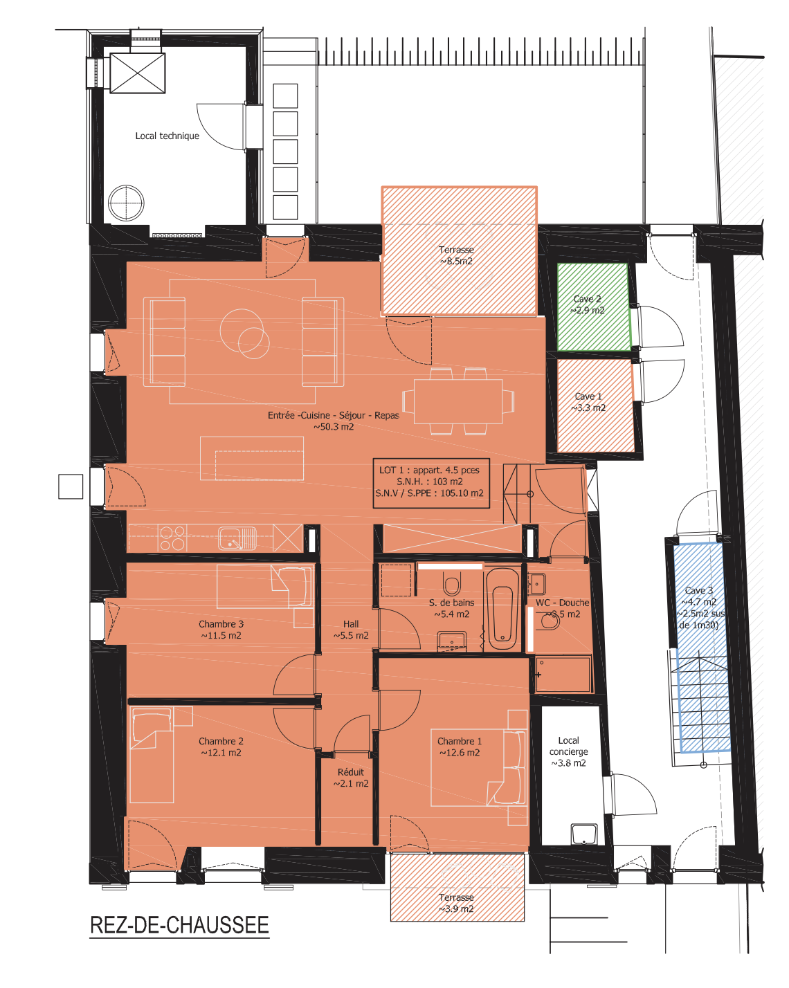 - Rez-de-chaussée : LOT 1 : 4.5 pièces d'environ 105 m2 + cave. Afin de profiter pleinement des extérieurs, cet appartement bénéficiera d'un grand jardin privatif ainsi que 2 terrasses totalisant environ 218 m2. CHF 885'000.--. Vendu !