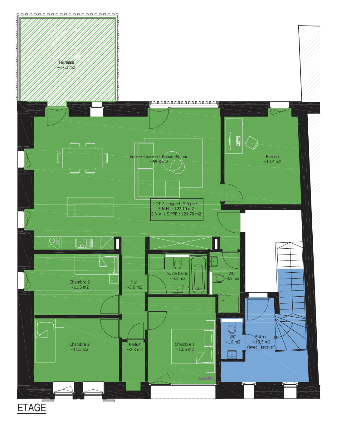 - 1er étage : LOT 2 : 5.5 pièces d'environ 125 m2 + cave. Une grande terrasse de plus de 17 m2 avec vue dégagée sur la chaîne des Alpes complètera ce bien. CHF 905'000.--.