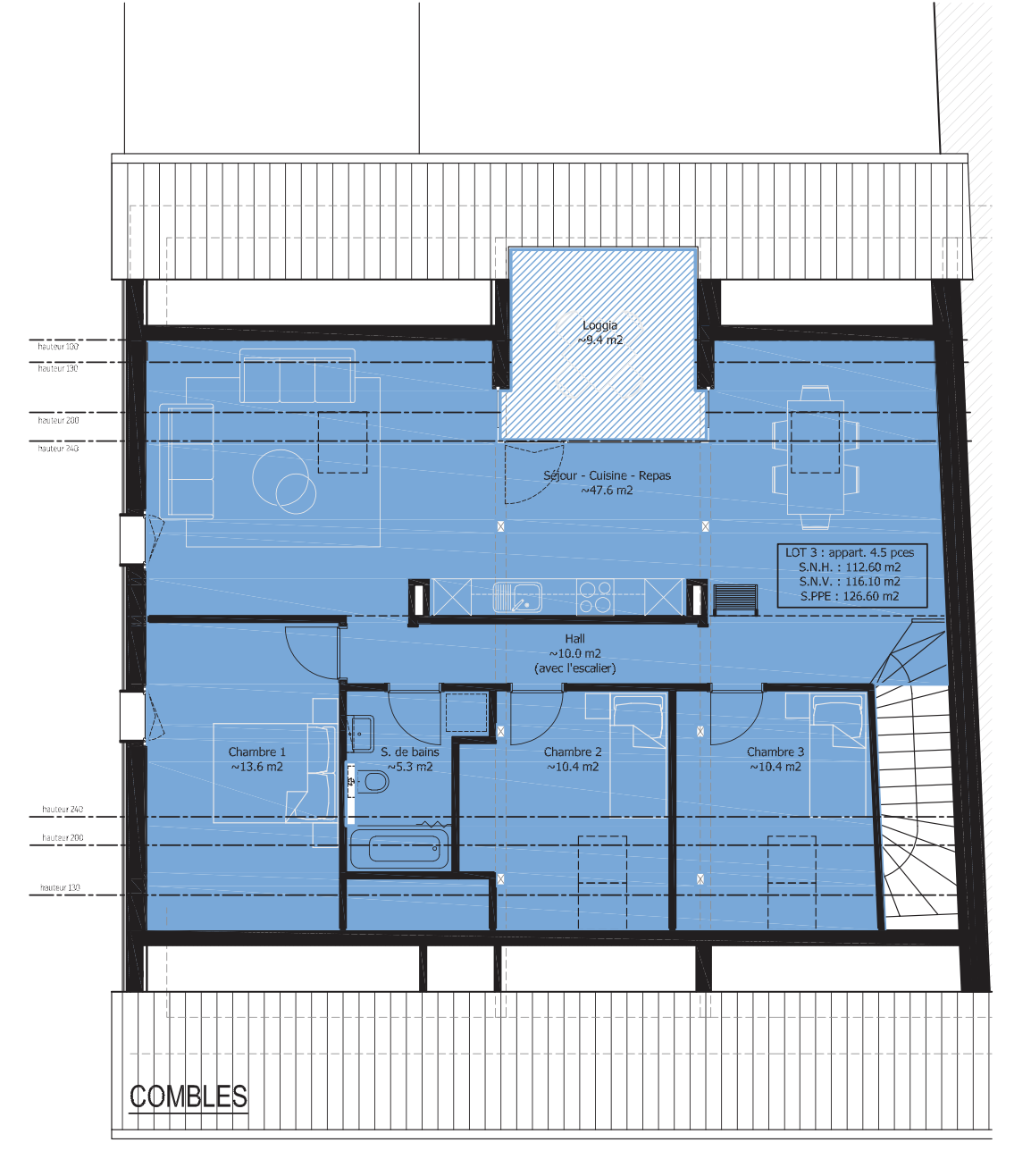 - 1er étage et combles : LOT 3 : 4.5 pièces d'environ 116 m2 + cave et grand galetas privatif. Une jolie loggia d'environ 9.4 m2 ainsi que des poutres apparentes procureront à cet appartement un charme tout particulier. CHF 815'000.--.